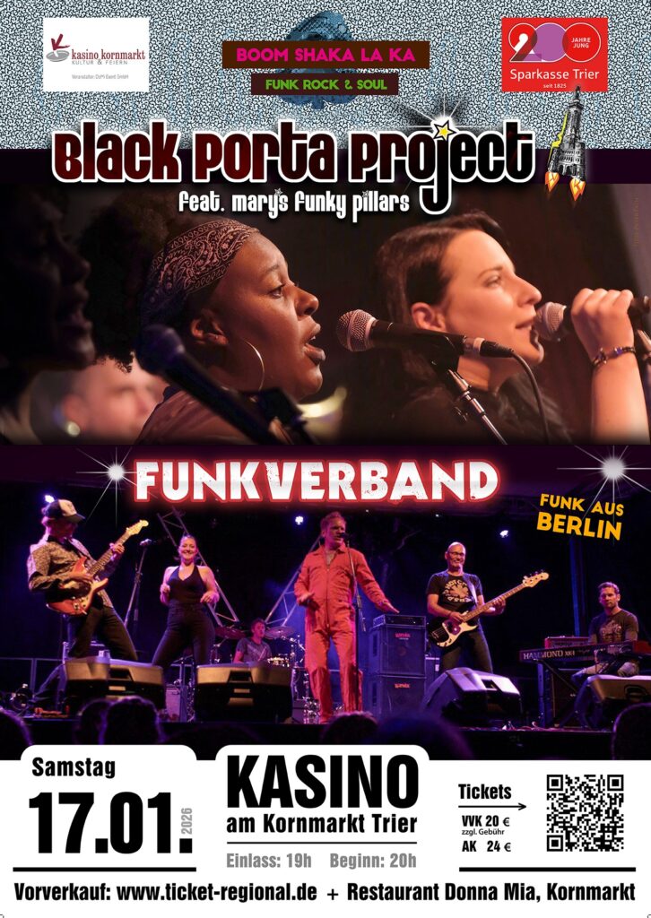 Let’s Party, mit vielen neuen Songs! Fette BlackBeatz aus der Region – dahinter verbirgt sich eine Fusion von Musiker:Innen aus der Region rund um die Porta Nigra, dem Sauertal, Luxemburg & Saarland, die mit breit gefächerter Besetzung aus Blech, Vocals, Keys, Strings & Beatz die treibende Kraft der Funk, Rock & Soul Musik auf die Bühne bringt – Motown und Stax bis zu aktuellen Vertretern des Genres lassen grüßen.