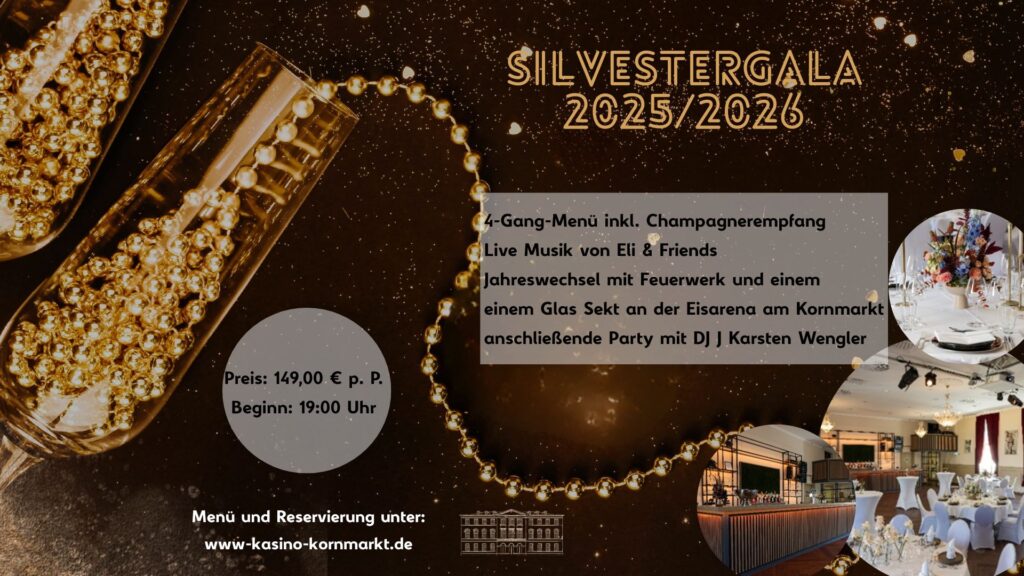Starten Sie stilvoll ins neue Jahr und erleben Sie einen unvergesslichen Silvesterabend im exklusiven Ambiente des neuen Kasino Kornmarkt – mitten im Herzen der Stadt. Genießen Sie ein gehobenes 4-gängiges Galamenü von Falko Weiß und seinem Team mit musikalischer Untermalung von Eli & Friends.